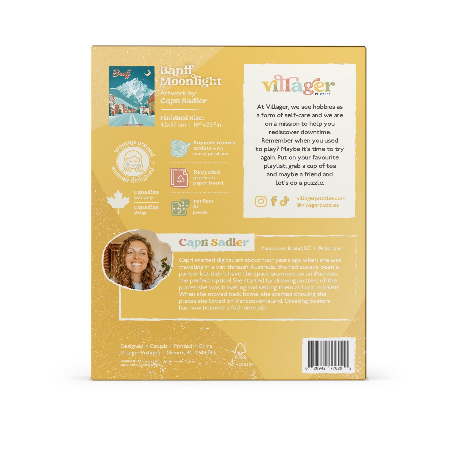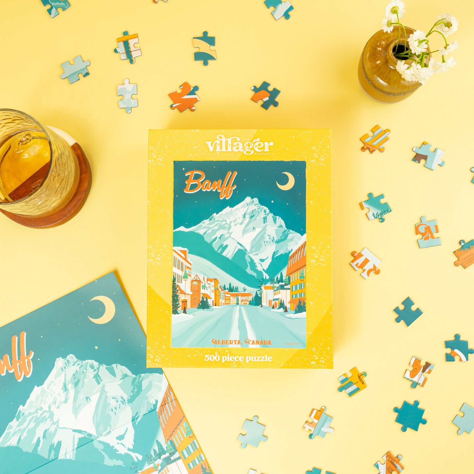 Embrace the magic of Banff with this beautifully illustrated travel poster puzzle. Your gateway to the serene beauty of Banff's moonlit landscapes. Feel the cool mountain air and unwind from the daily grind as you piece it all together. Designed by local artist and nature lover, Capri Sadler.