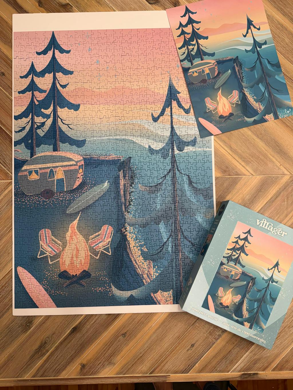 Enjoy a gorgeous pastel-coloured sunset overlooking the ocean. Beautifully-illustrated travel poster puzzle of a cozy camping trailer perched on a cliff about the peaceful ocean waves below. Designed by Vancouver Island artist Capri Sadler.