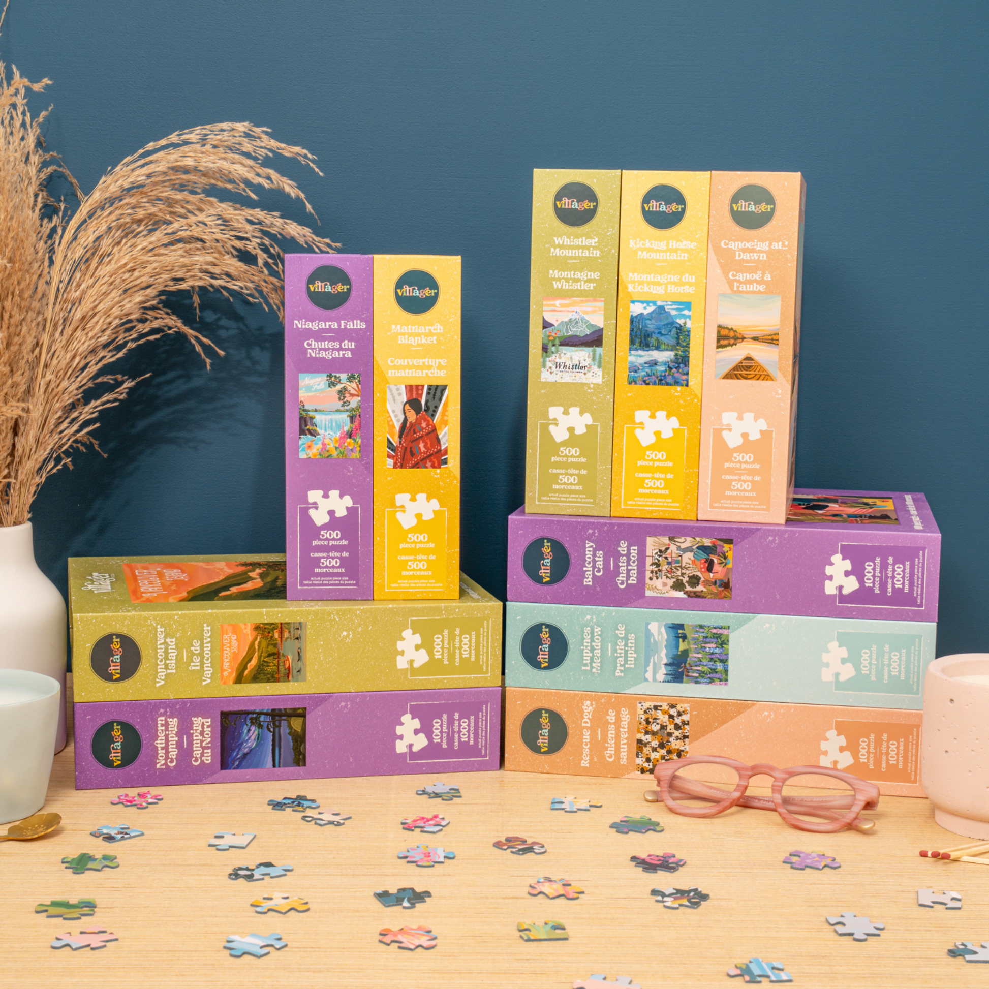 - 5 X 1000 piece puzzles (Northern Camping, Lupines Meadow, Rescue Dogs, Balcony Cats, Vancouver Island) & 5 X 500 piece puzzles (Canoeing at Dawn, Matriarch Blanket, Whistler Mountain, Niagara Falls, Kicking Horse Mountain)