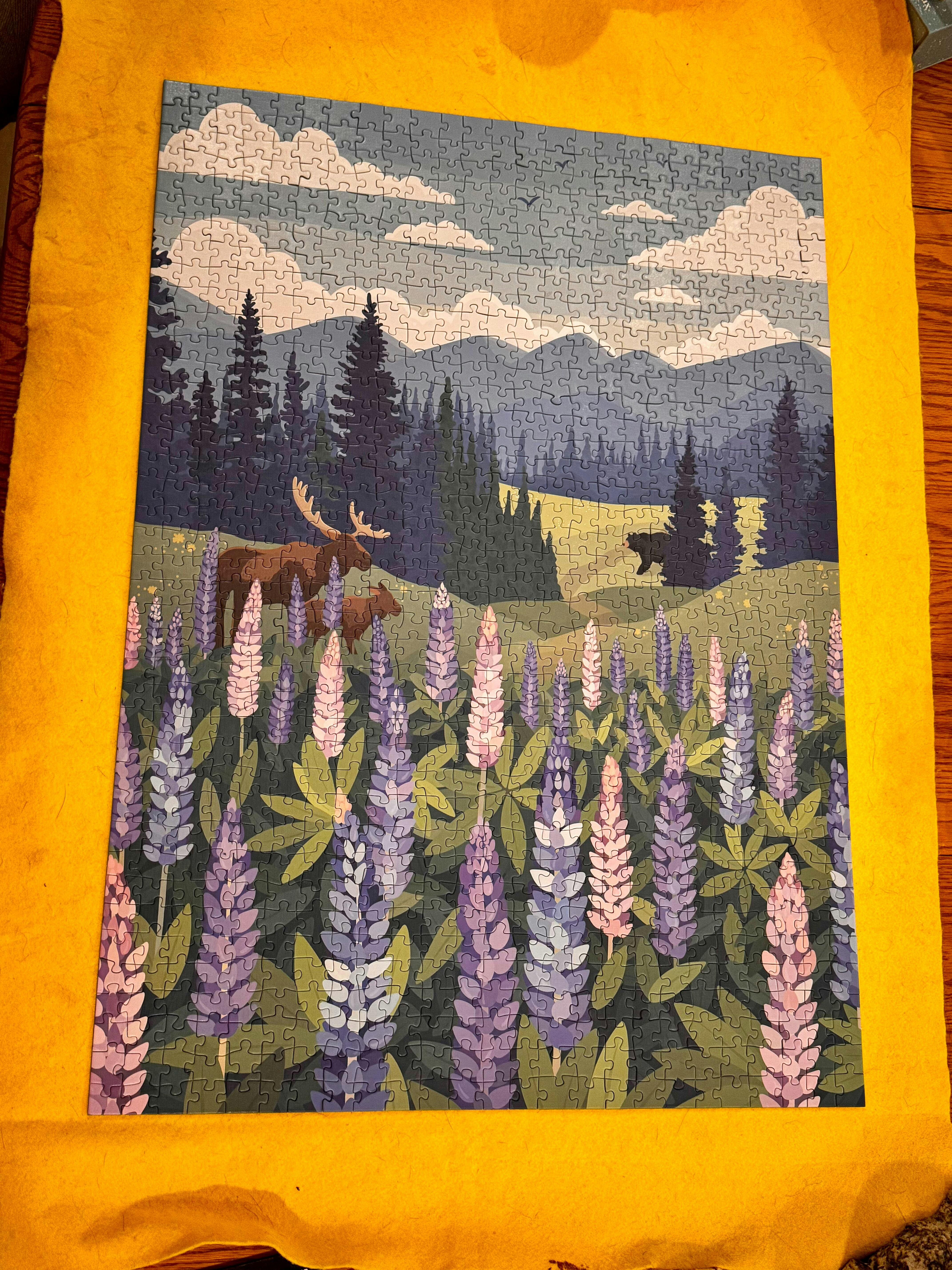 Step into a wild and whimsical meadow with this stunning puzzle, featuring rolling hills blanketed in blue and purple lupines. Designed by Newfoundland artist Diana Pinnell, this vibrant scene is a love letter to the untamed beauty of nature—complete with curious moose, a wandering bear, and trees swaying in the breeze. Perfect for outdoor lovers, this puzzle brings the magic of blooming fields and forest wildlife into your home, one peaceful piece at a time.