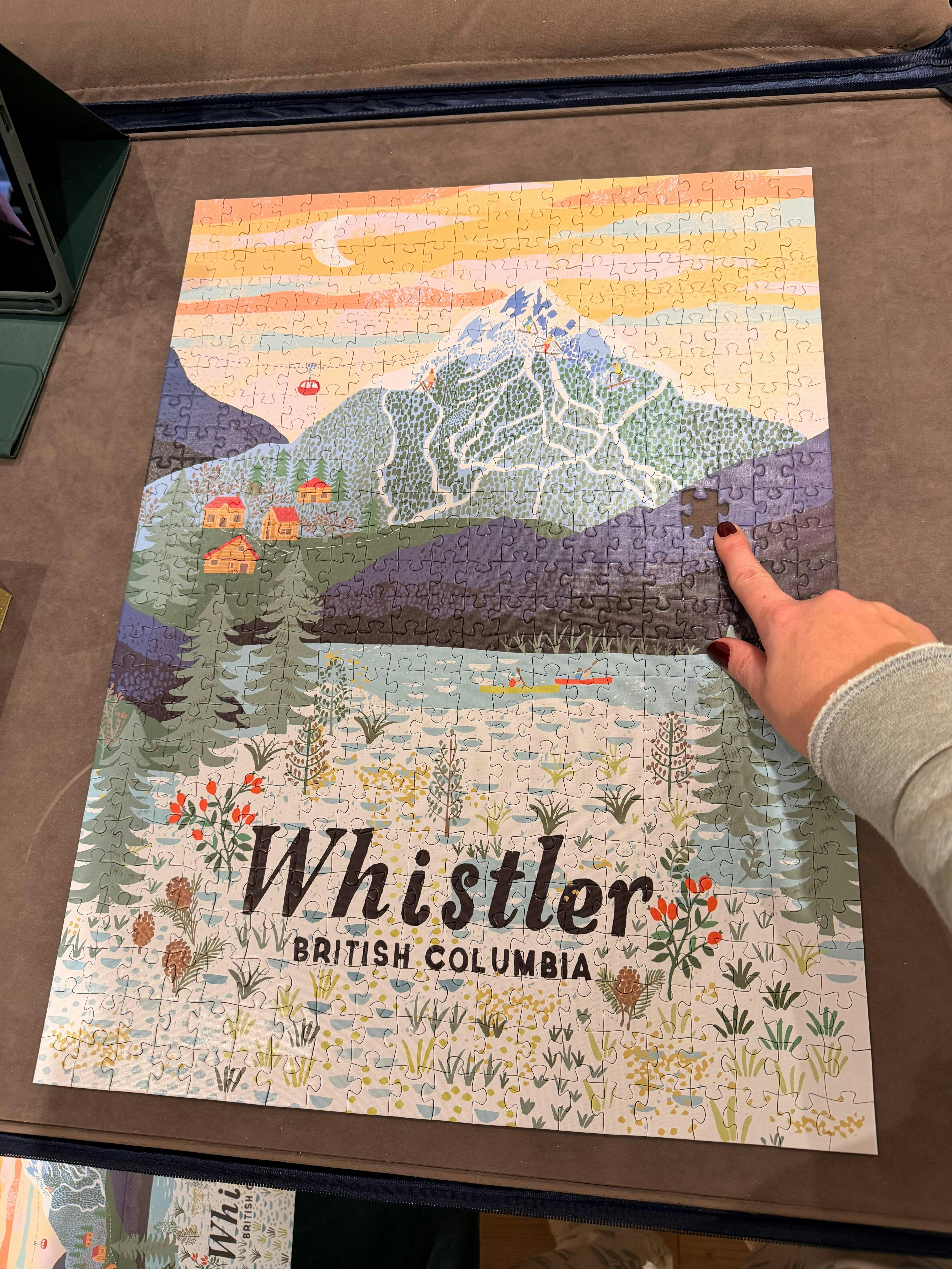 Escape to a snowy alpine dream with this whimsical puzzle, featuring the iconic slopes of Whistler Mountain beneath a pink sunset sky. Designed by Bowen Island artist Anja Jane, this charming scene is filled with cozy cabins, winding ski runs, and a gondola gliding overhead—all illustrated in her signature textured style. Perfect for travel lovers and mountain daydreamers alike, this puzzle captures the magic of winter adventure and après-ski charm, one delightful piece at a time.